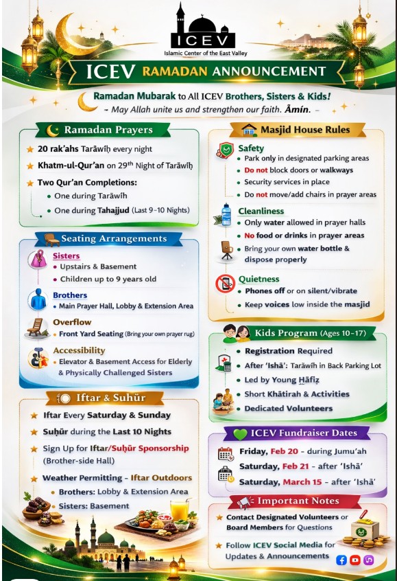 Available Days & Nights: Fridays (During Jumu’ah & Taraweeh)Saturdays & Sundays (During Iftar & Taraweeh)